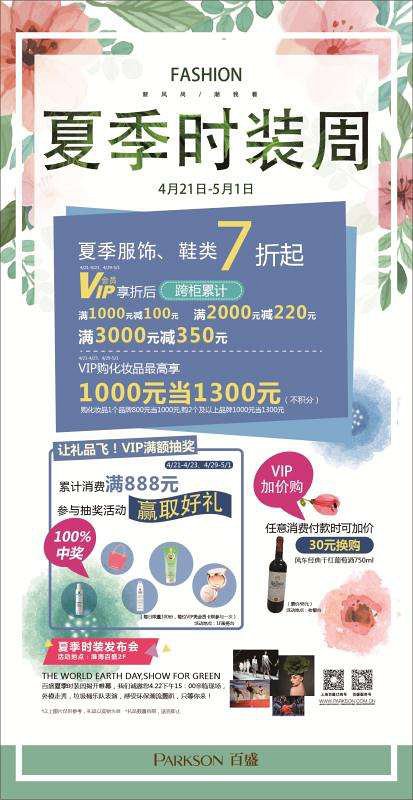 4.22世界地球日,百盛为您揭幕THE WORLD EARTH DAY,SHOW FOR GREEN夏季时装发布会,夏季服饰,鞋类7折起,更有VIP折上后享受满减,融合最新时装资讯,环保潮流轰趴,外模走秀大赏,垃圾桶乐队,只等你来!